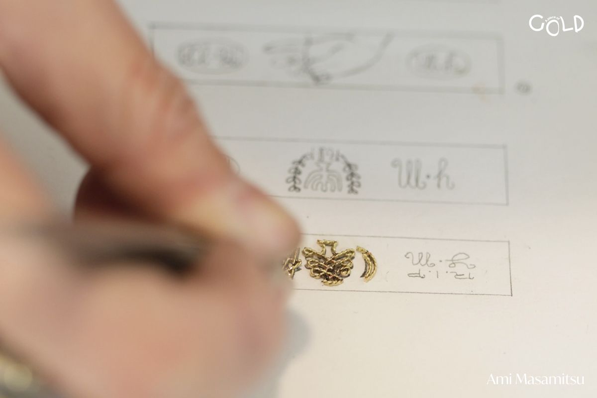 クラシックでありながら、着用性やユーモアをバランスよく編み込んだ同作は、0.4mm厚のフラットなリングの上に、絵画を描くように金線で文字や絵を一つ一つレーザー溶接して制作されています。このシリーズはビスポークとして個別受注もしており、あらゆる人と唯一無二のピースを作るための試みにもなっています。