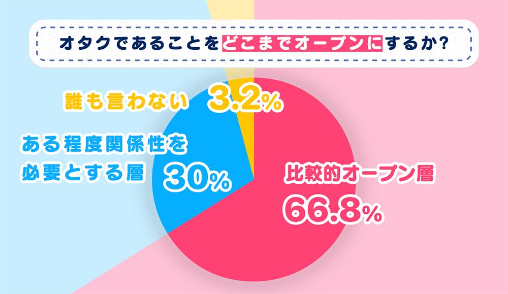 まず、オタクであることをどこまでオープンにするかとの問いでは、66.8パーセントが「比較的オープン」だと答えている。「誰にも言わない」という人は3.2パーセントに過ぎず、基本的にオープンな人が9割を超える。だが「隠さないからこそ、とくに仲良くもない人に推しについてイジられるのがイラッときます」と心ない言葉に傷つくこともあり、それは周囲の人との関係によって決めている。