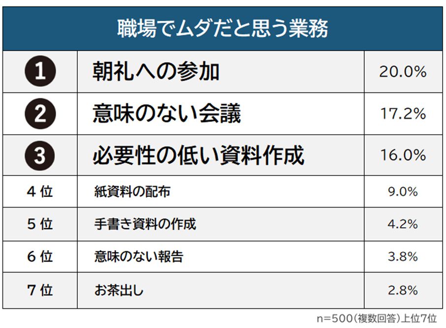 1位「朝礼への参加」。「内容がいつも同じで時間のムダ」、「周知するツールがあるのに、わざわざ集まって朝礼して同じことを伝えるから」といった意見が聞かれた。