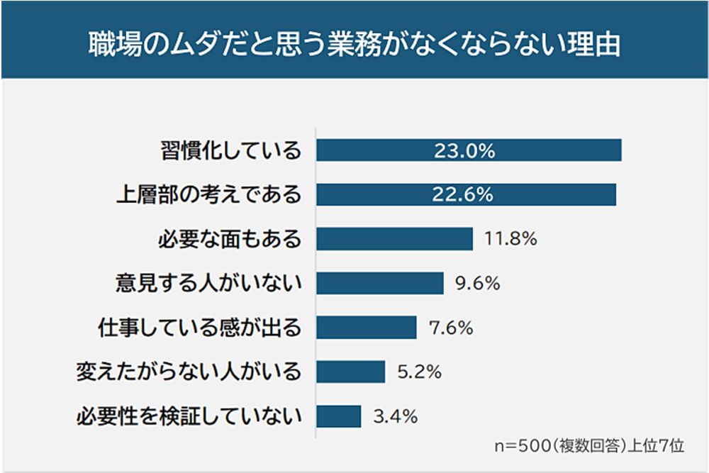 これらの無駄がなくならない理由を聞くと、習慣化、上司の意向という2つが大きく浮かび上がった。「これまでずっとやってきたからだという慣習。現場の効率よりも形式を重視する文化」という20代の女性の意見は正鵠を得ている。6位の変えたがらない人がいるという意見も、これに通じる。変化を嫌う「現状維持バイアス」のお手本とも言える。