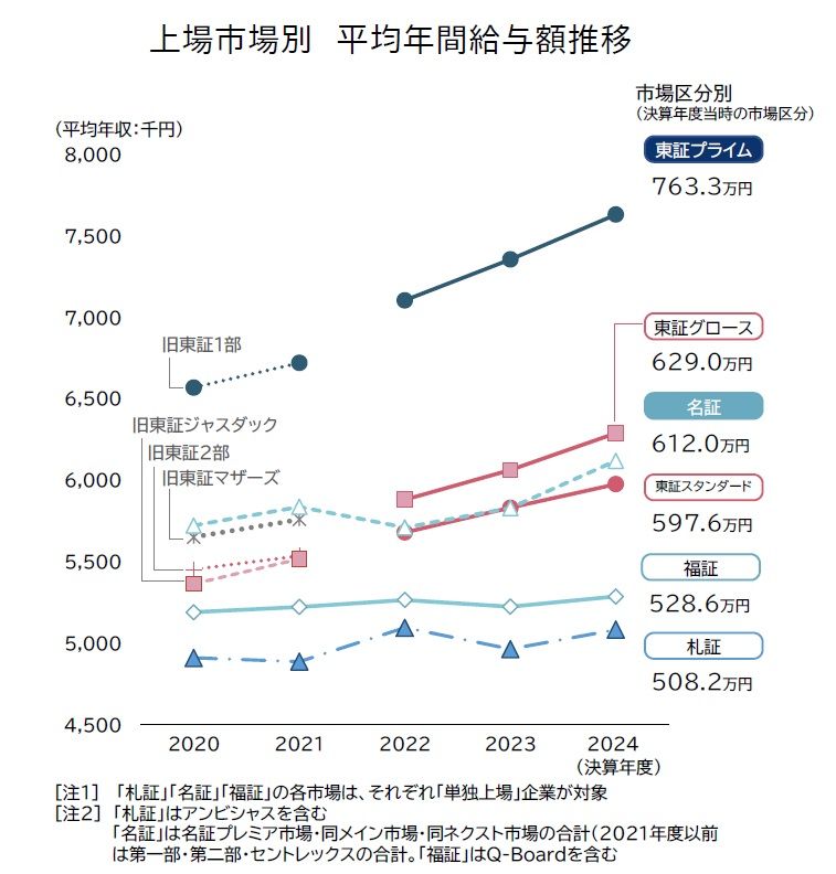 上場市場別にみると、「東証プライム」が763万3000円でダントツトップ。次いで「東証グロース」の629万円、「名証」の612万円だった。