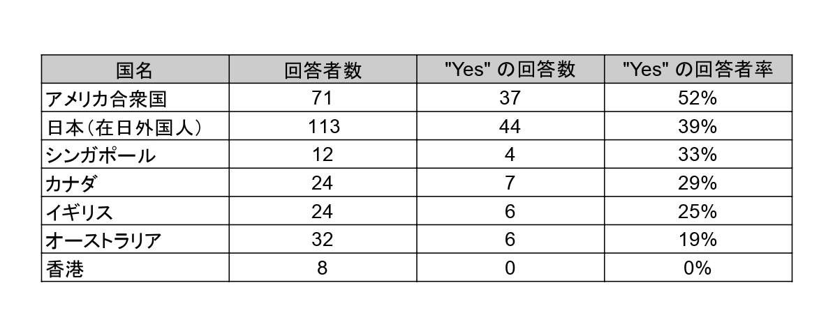今回の回答者を国籍別に集計したところ、「はい」と回答した人はアメリカが多く、在日外国人でも4割を切り、シンガポール、カナダ、イギリスなどはかなり低い結果となっている。意外と日本文化の中で生活をしている在日外国人でも、温泉には抵抗があるようで、文化の違いの壁はかなり大きいと感じる結果となった。