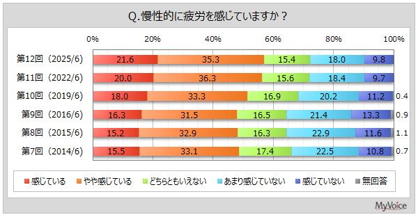 それによると、まず慢性的に疲労を感じている人は、「感じている」「やや感じている」を合わせて6割弱いることがわかった。男性の40~50代ではそれぞれ6割強、女性の10~50代では7割前後と全体より割合が高くなっている。