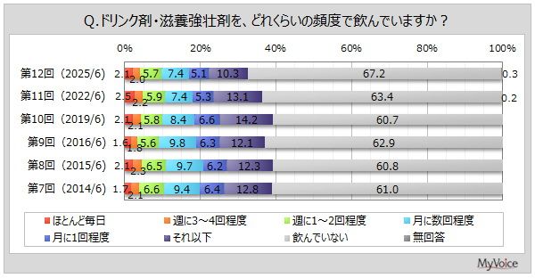 ドリンク剤・滋養強壮剤の利用については、約3割の人が利用していると回答。週1回以上飲む人は1割に達し、慢性的に疲労を感じていると回答した人は4割強近くに上っている。ただ、疲労を感じている人は増加傾向だが、飲む頻度としては2019年の調査以降減少傾向で、ドリンク剤・滋養強壮剤離れがみられる。