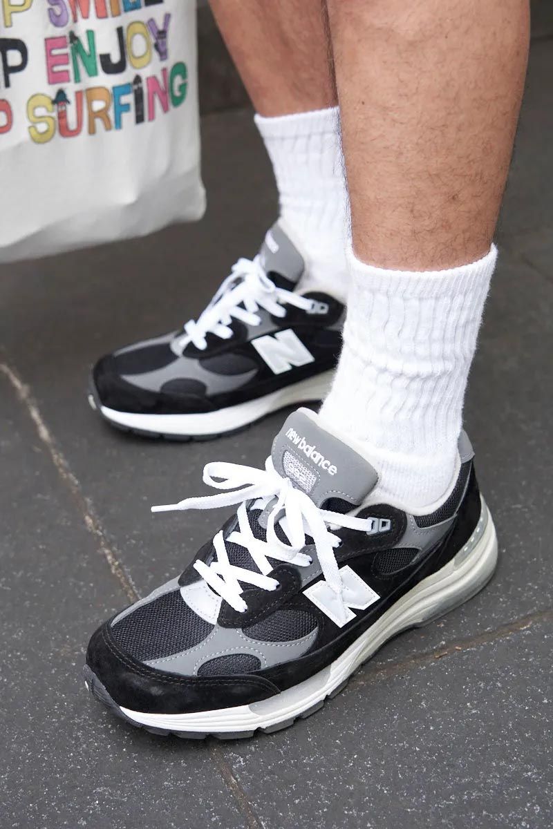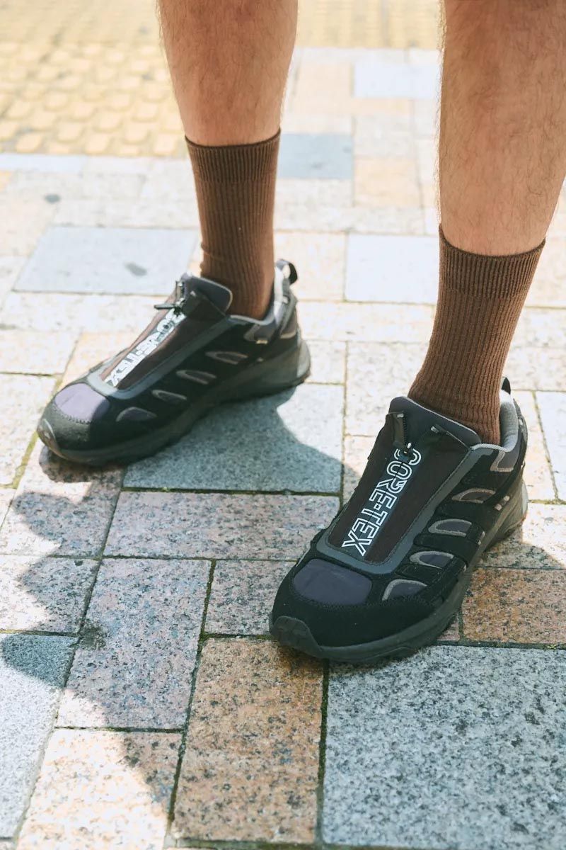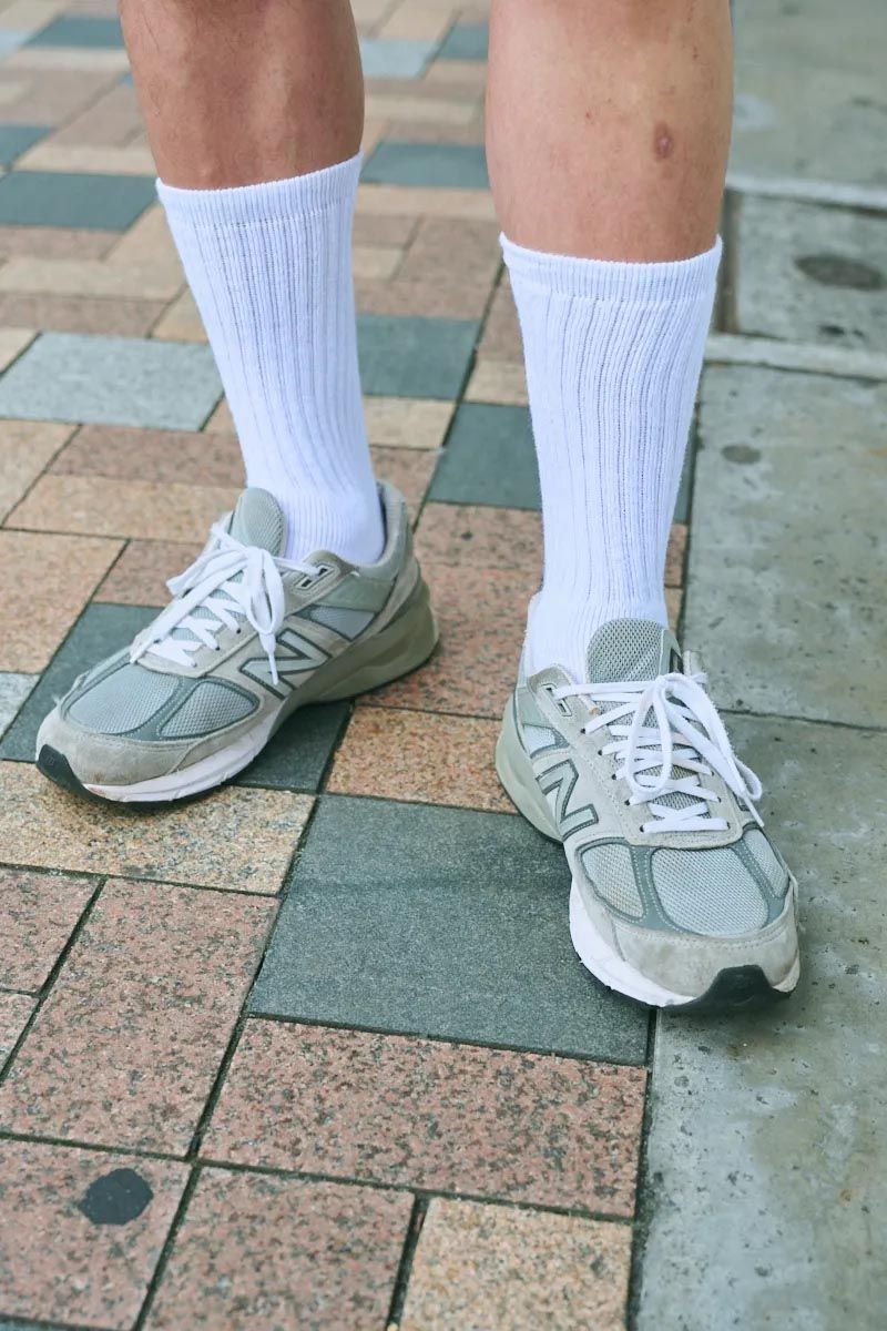 ポイントは、派手なカラーソックスではなく定番色を使うこと。宮本さんのようにスニーカーの配色の一部を拾うと、よりまとまって見える。
