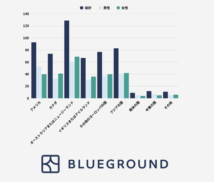 興味深いのは男女の嗜好の違いで、男性はアメリカ(38%)を希望する割合が女性(29%)より高い一方、女性はオーストラリア・ニュージーランド(女性51%、男性44%)やカナダ(女性30%、男性24%)を好む傾向が見られた。