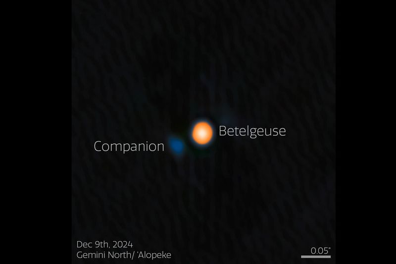 オリオン座の1等星で、赤色超巨星のベテルギウス(Betelgeuse、右)とその伴星(Companion、左)を、ジェミニ北望遠鏡に搭載のスペックル撮像装置アロペケ(Alopeke)で捉えた画像。2024年12月9日撮影(International Gemini Observatory/NOIRLab/NSF/AURA, Image Processing: M. Zamani (NSF NOIRLab))