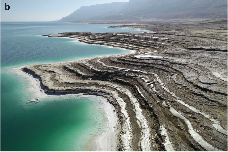 死海の湖岸線と砂浜。過去数十年にわたって急速な湖水面の低下(1m/年)が進行している過程が見られる(Figure 1(b), Eckart Meiburg and Nadav G. Lensky, Annual Review of Fluid Mechanics Volume 57, 2025)