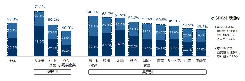 企業規模別にみると、「大企業」は71.1%が積極的であるのに対し、「中小企業」は50.2%、「小規模企業」は40.8%に留まっている。規模による格差が浮き彫りとなった。