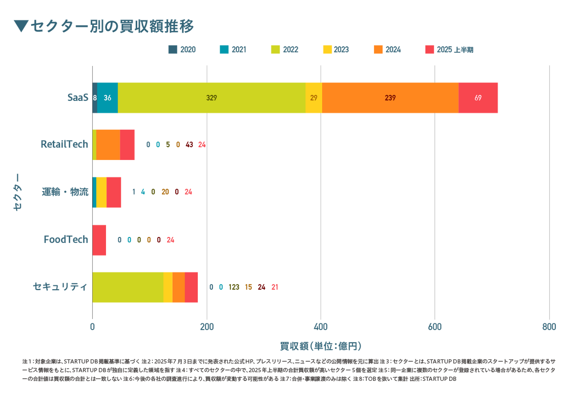 2025年上半期における買収額が69億円、買収件数が22件に達したSaaS領域では、ゆめみが37億円、etailTech・FoodTechや運輸・物流の領域では、飲食店向けに食材受発注プラットフォームを提供するタノムが23億8,000万円で買収された事例が牽引した。さらにセキュリティ領域では、ポラリファイが15億円で買収された事例が代表的である。