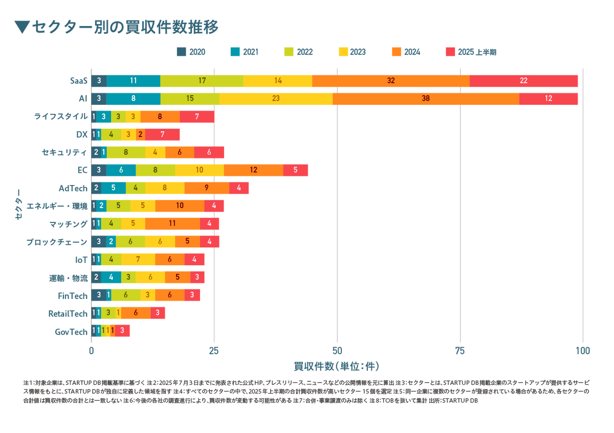 2025年上半期に買収額や買収件数が高かったセクターを集計した。買収額・件数ともにSaaSがトップを牽引し、買収件数ではAIも存在感を示した。