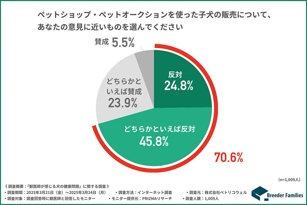 それによると、ペットショップやオークションを経由して販売されることに反対する獣医師は70.6パーセントとなった。