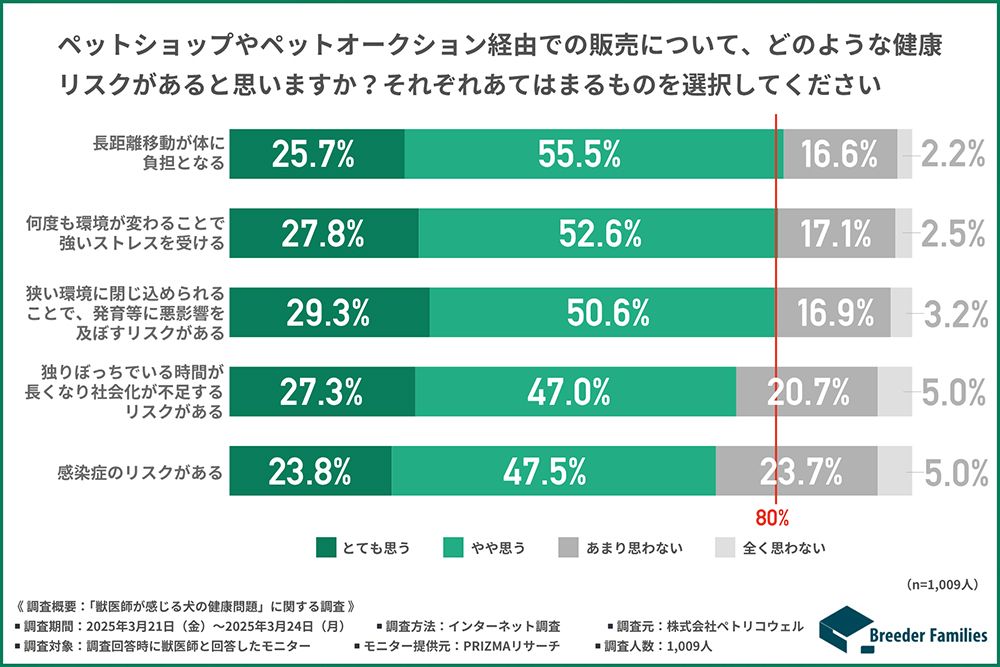 こうした流通システムが子犬に与えるリスクをたずねると、約8割の獣医師が、長距離移動による体の負担、何度も環境が変わることによる強いストレス、狭い環境に閉じ込められることによる発育への悪影響、ひとりぼっちでいる時間が長いことによる社会化の不足を指摘している。社会化とは、犬同士や犬と人間との良好な関係を築くために必要な幼年期の成長過程だ。