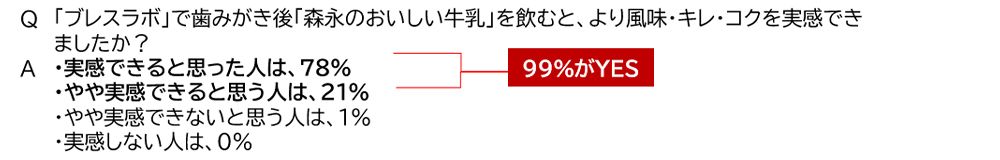 すると、牛乳本来の風味、キレ、コクが増したと実感できた人は78パーセント、やや実感できた人は21パーセントだった。なんと99パーセントが味の変化を認める結果となった。