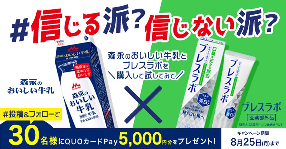 第一三共ヘルスケアと森永乳業は、今回のチャレンジに引き続き、この結果を信じるか信じないかを問うキャンペーンを8月25日まで実施している。これらの製品を購入して試した感想を、XのブレスラボPRアカウントをフォローして、「#信じる派」または「#信じない派」のハッシュタグを付けてポストすると、抽選で30名にQUOカードPay5000円分が当たるということだ。