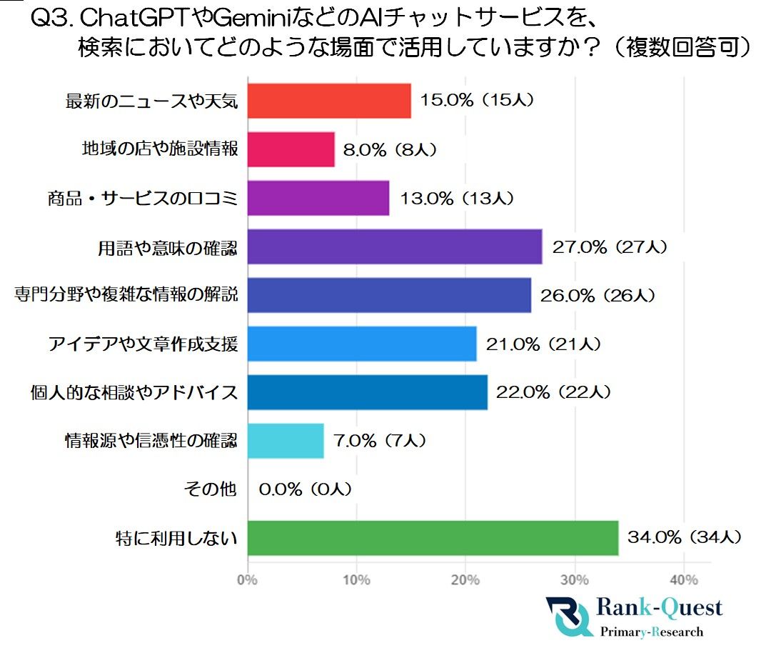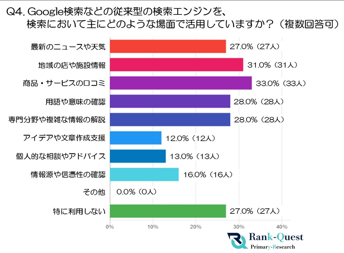 一方、従来型検索エンジンを用いるのはどのような場面かの質問には、「商品・サービスの口コミ」が33%、「地域の店や施設情報」が31%、「用語や意味の確認」「専門分野や複雑な情報の解説」が28%となっている。この結果から、実用的かつ具体的な情報を探す場面においては、情報量が豊富で絞り込みもしやすい従来型検索が優位に働く傾向が見られる。用語や専門分野の情報に関してはAI検索でも上位に挙がるが、最近では従来の検索サイトでもAIによる結果提示が行われており、その情報で十分と考える層も少なからずいそうだ。
