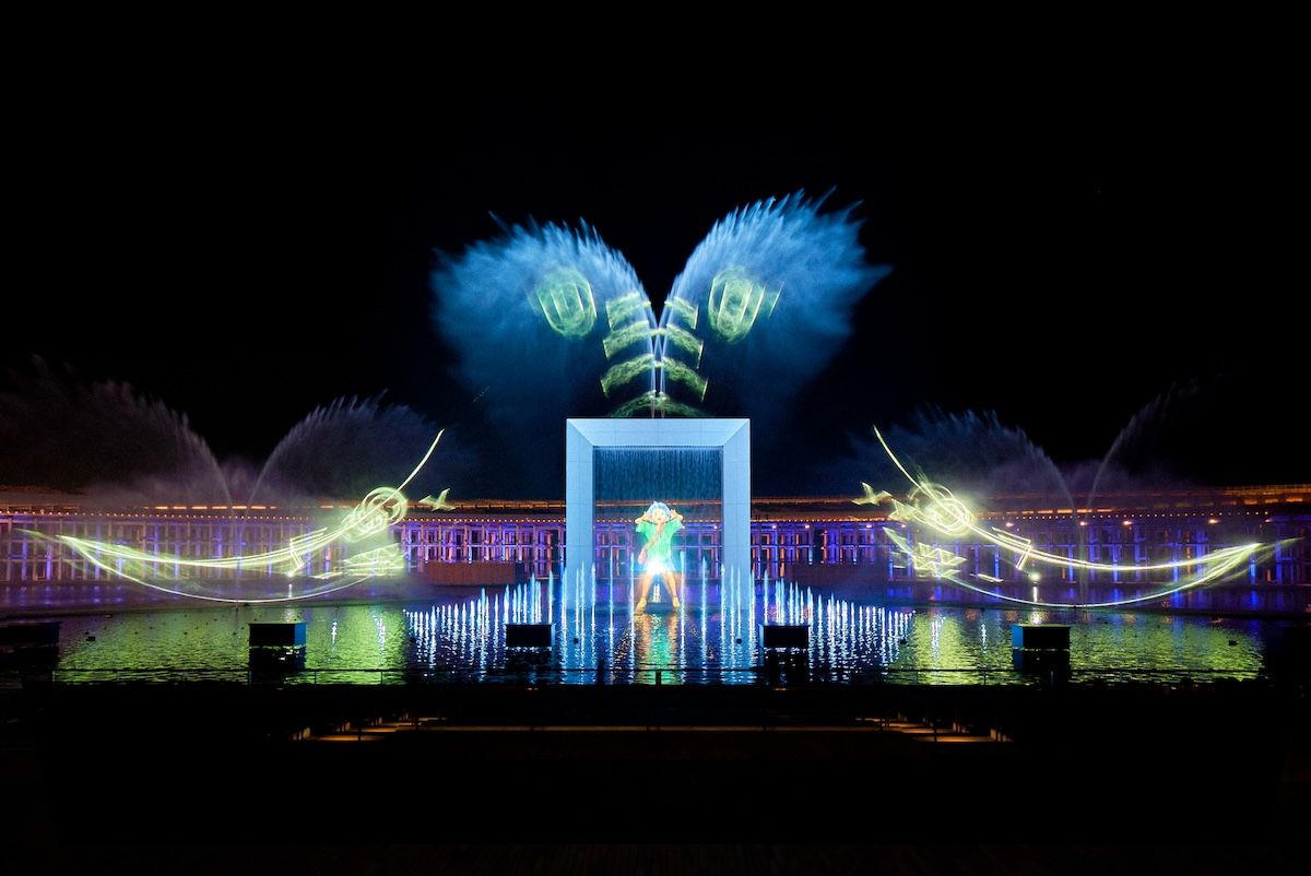 大阪・関西万博のウォータープラザを舞台とする「アオと夜の虹のパレード」は、会期中毎晩2回上演される水上スペクタクルショーだ。
