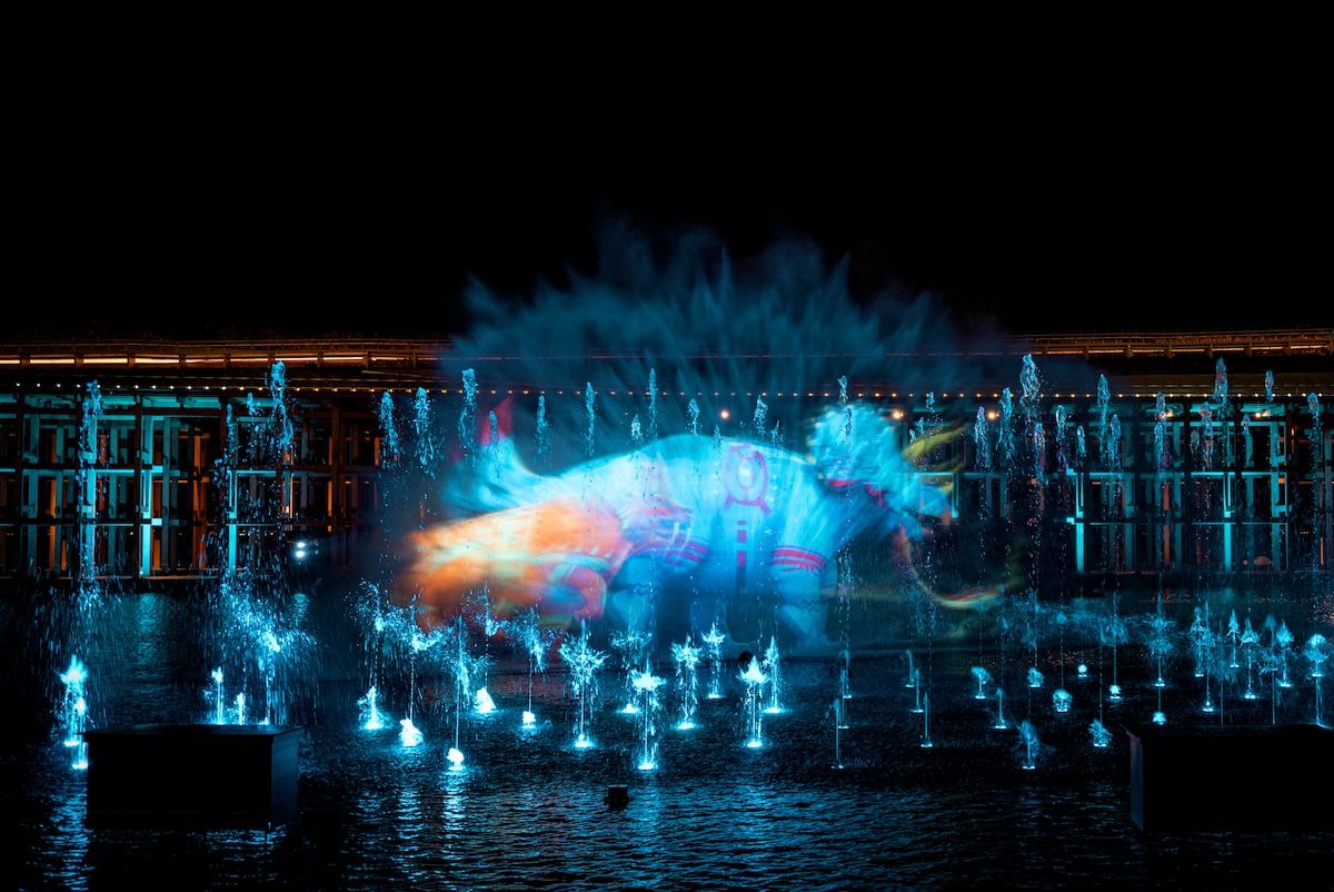 ウォータープラザの中央には、水のスクリーンをつくりだす「ウォーターカスケード」がそびえたち、幅約200メートル、奥行き約60メートルの立体的な舞台空間となる。約300基の噴水から放たれた水は、風のように空間を駆け巡ったかと思えば、熱い炎を一瞬にして鎮め、生命の躍動をダイナミックに表現する。さらに、炎やスモークといった特殊効果、そして臨場感を高める立体音響が融合し、観客は幻想的なストーリーへと没入していく。