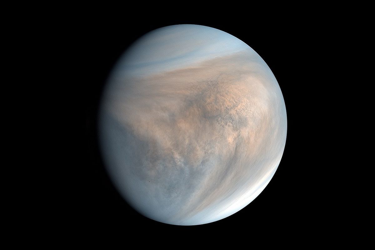 宇宙航空研究開発機構(JAXA)宇宙科学研究所(ISAS)の金星探査機「あかつき」が紫外線で捉えた金星の昼面の合成擬似カラー画像。全体を覆う硫酸でできた雲の高度約70 kmにある雲頂付近を観測していると考えられている。あかつきに搭載の紫外線カメラUVIで2016年12月23日に撮影(ISAS/JAXA)