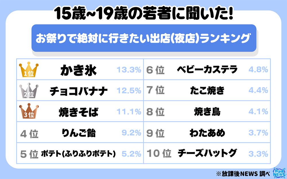 「放課後NEWS」は、10代または現役高校生を対象にしたマーケティング情報サイト。全国の15歳から19歳を対象にアンケート調査を実施し、人気の屋台トップ10を公開した。そこから、若者たちのお祭りの楽しみ方が見えてくる。