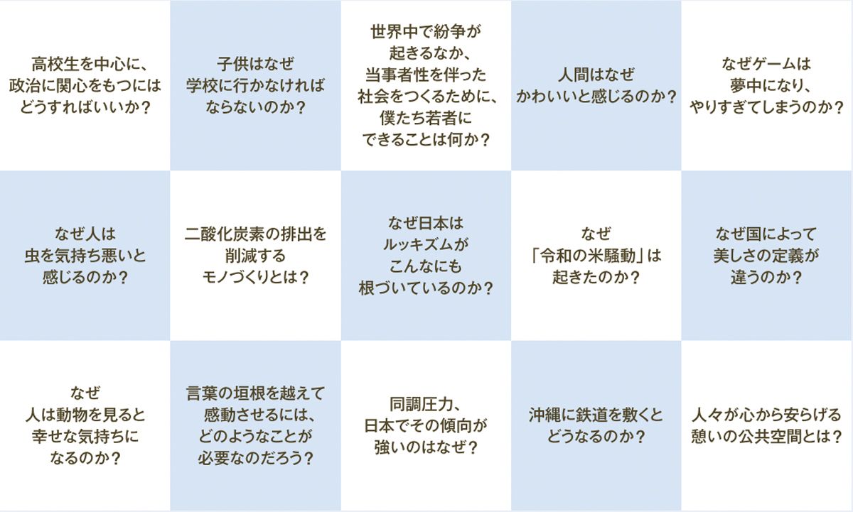 「Inspired100」という名称で、10代の100人の問いを表彰して年鑑を制作したのは、「社会とのつながり」をより多くの生徒たちに実感してもらいたかったからです。1位、2位などのグランプリ形式にしなかったのもそれが理由です。「Session」に出演したガイド3人と企業15社に選出に携わってもらい、自分の「問い」が本気であれば社会は答えてくれることを伝えたいという思いがありました。結果今回は、「Social& Business」「Human &Culture」「Science & Innovation」の3部門で、2500件のエントリーから100の問いが選ばれました。下記表の15の問いに代表されるような「自分にまっすぐな問い」が数多かったのが印象的でした。
