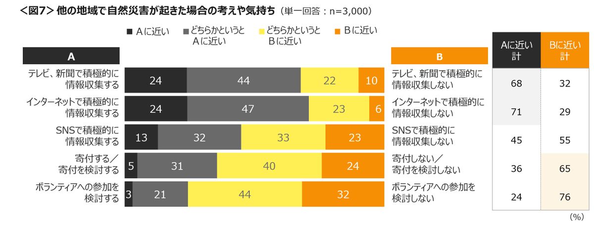 自分が住んでいる場所ではなく他の地域で災害が起きたときの考えや気持ちについては、「テレビ・新聞」「インターネット」で積極的に情報収集する人は7割前後。一方、「ボランティアへの参加を検討する」「寄付をする/検討する」「SNSで積極的に情報収集する」は半数を下回った。情報収集はSNSよりテレビやインターネットが多いことから、SNSでの偽情報や誤情報の拡散を警戒している可能性がうかがえる。