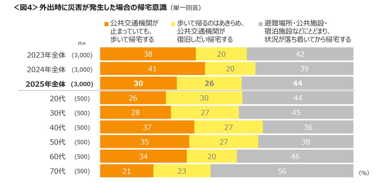 外出時に災害が発生した場合の帰宅意識は、「避難場所などにとどまり、状況が落ち着いてから帰宅する」が44%であった。ただ「公共機関が復旧しだい帰宅する」「公共機関が止まっていても、歩いて帰宅する」が合わせて56%となり、少しでも早く自宅へ帰りたいと思う人のほうが多いことがわかる。