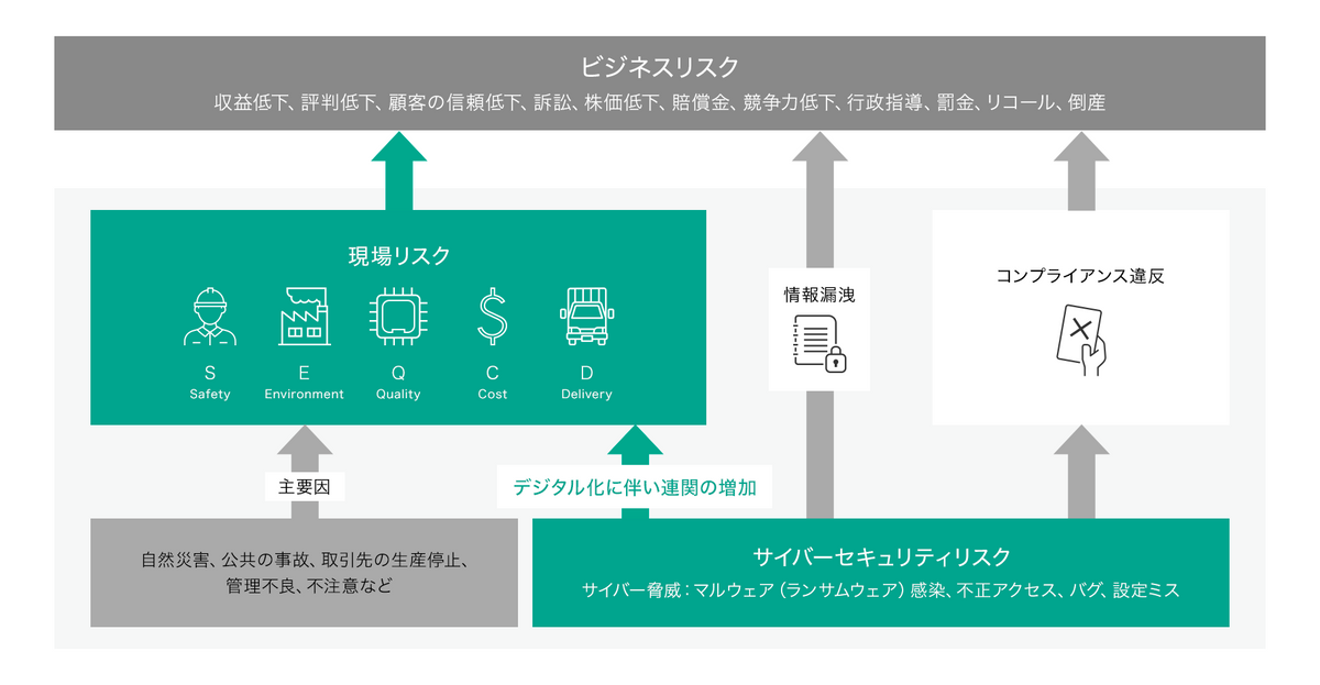 「例えば製造業の場合、安全性・環境・品質・コスト・納期の5つを軸に、現場のリスクを管理し、安定した生産活動を維持しています。ところが、各項目について対策を講じていても、サイバー攻撃を受けるとすべての項目が連鎖的に影響を受ける可能性があります。ランサムウェア(身代金要求型の悪意あるソフトウェア)によって生産ラインが停止すると納期は遅れ、急な工程変更で品質に問題が生じる可能性が高まる。さらに、混乱のなかで人件費が増加し、コストもかさみます。