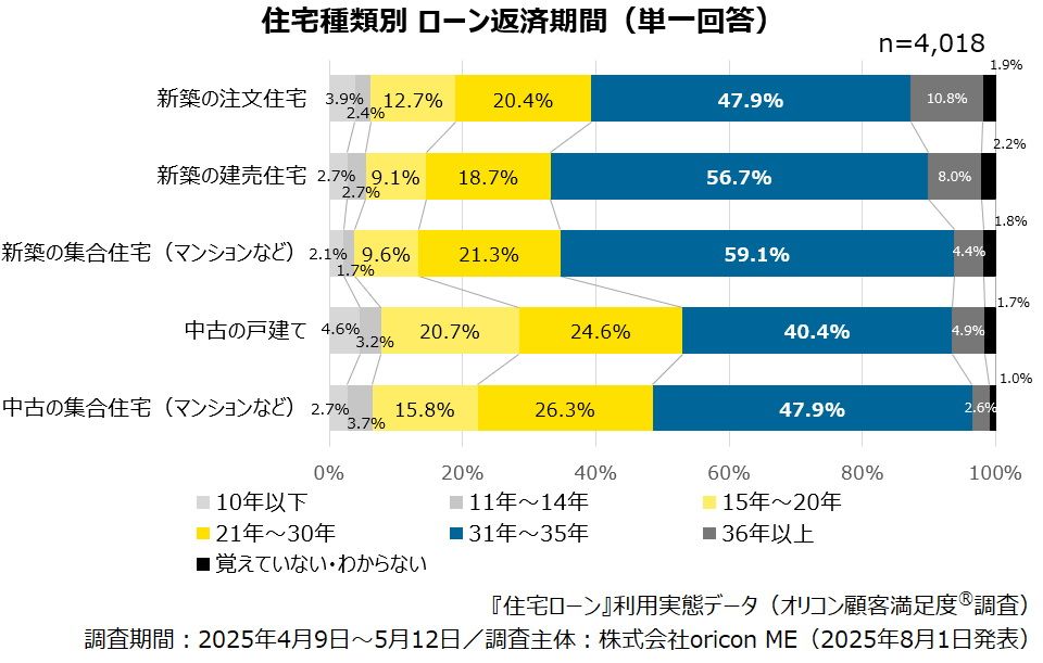 実際に借り入れているローンの返済期間は、「31年~35年」が50.6%と約半数を占め、「21年~30年」が21.6%、「15年~20年」が12.8%と続いた。住宅種類別では、新築物件が長期間のローンを組む傾向にあり、中古戸建てでは15年~30年の層が多い実態だ。
