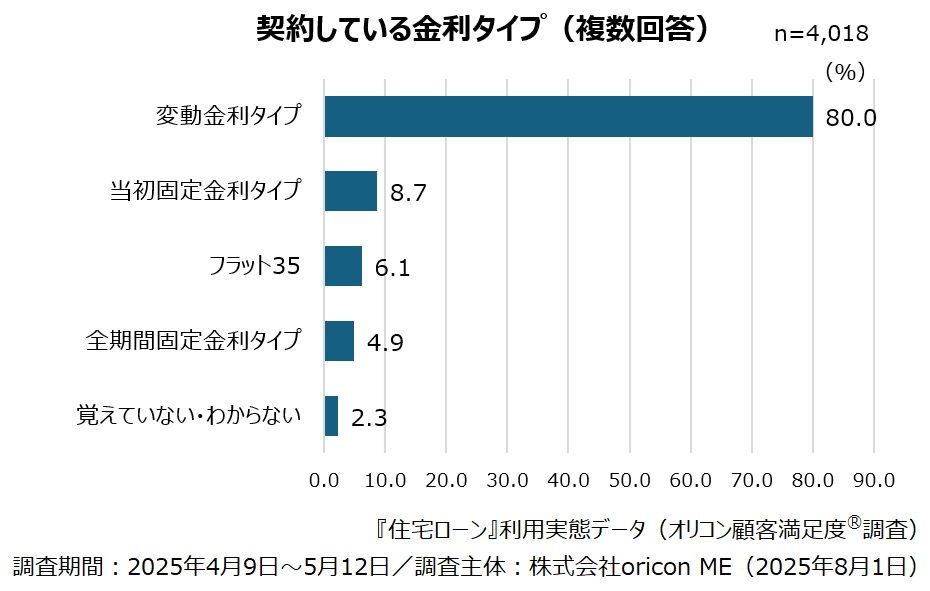 それによると、契約している金利タイプは「変動金利」が80%で圧倒的なトップとなっている。次いで「当初固定金利」が8.7%、「フラット35」が6.1%と続く。近年は金利が上昇傾向にあるが、低金利で柔軟性を重視する変動金利が依然として人気のようだ。
