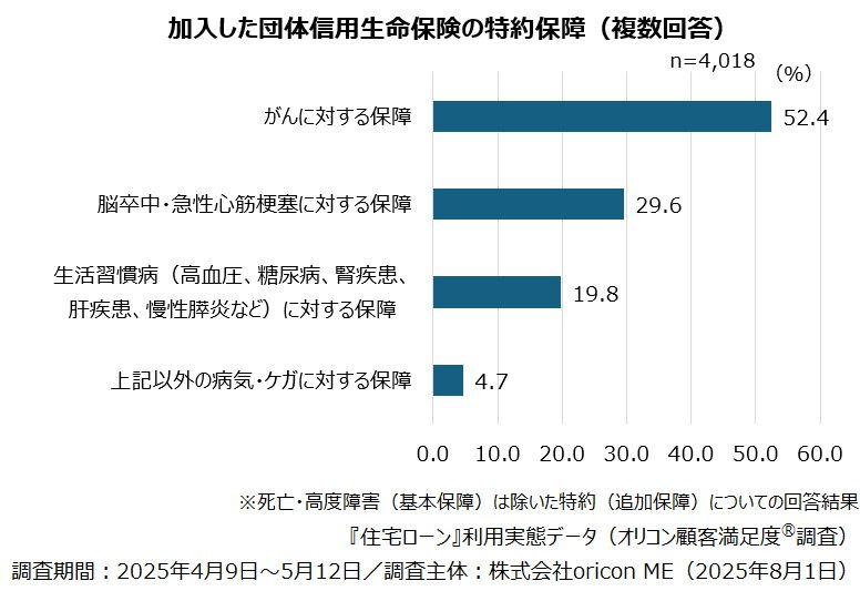 住宅ローン契約時に加入する団体信用生命保険の特約保障については、「がんに対する保障」が52.4%と最も多く、「脳卒中・急性心筋梗塞に対する保障」が29.6%、「生活習慣病(高血圧、糖尿病、腎疾患、肝疾患、慢性膵炎など)に対する保障」が19.8%と続いた。