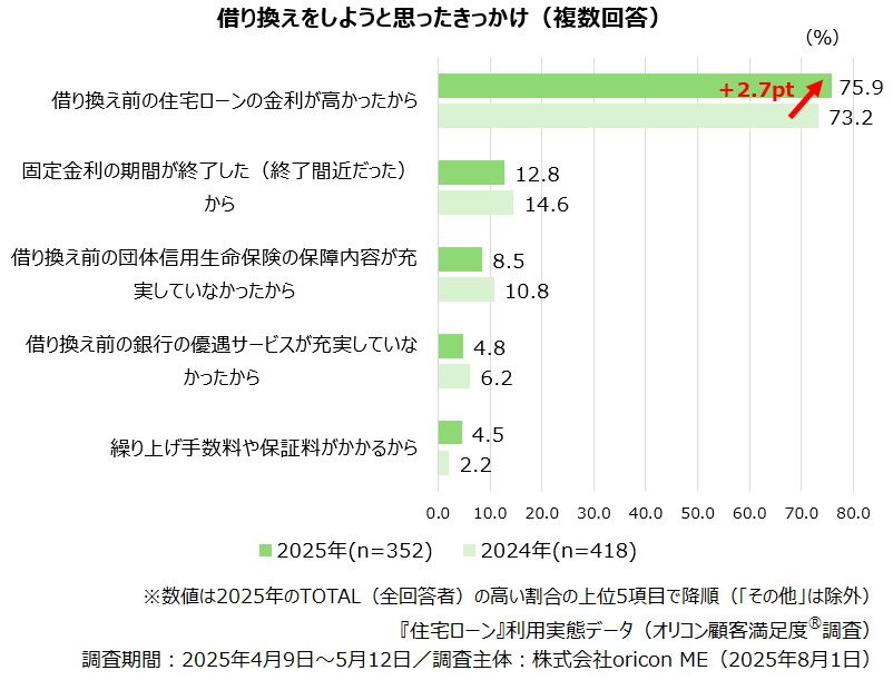 住宅ローンの借り換えのきっかけは、「借り換え前の住宅ローンの金利が高かったから」が75.9%で最も多く、2024年からは2.7ポイント増加した。変動金利に対する不安も昨年より高まっているとされ、物価高騰による住宅ローン返済への不安を感じる層が一定数存在するようだ。