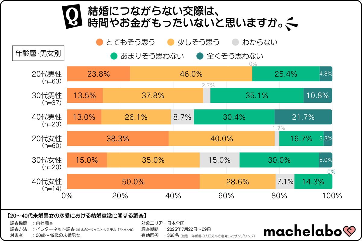 結婚につながらない交際は、時間やお金がもったいないと思うかとの問いに、「とても思う」「少しそう思う」を合わせると20代が74.0%と、30代の50.8%、40代の54.0%に比べて20ポイント以上の差がついている。最近の若者は「タイパ(タイムパフォーマンス)」を重視する傾向にあるが、人間関係においても同様にタイパを意識している実態がうかがえる。