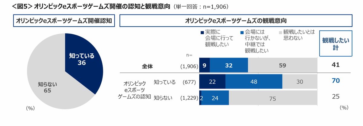 2027年にサウジアラビア王国で初開催される「オリンピックeスポーツゲームズ」の認知度は36%にとどまる。非認知層は観戦意欲が低い傾向にあるが、認知層に限定すると7割が観戦を希望している。