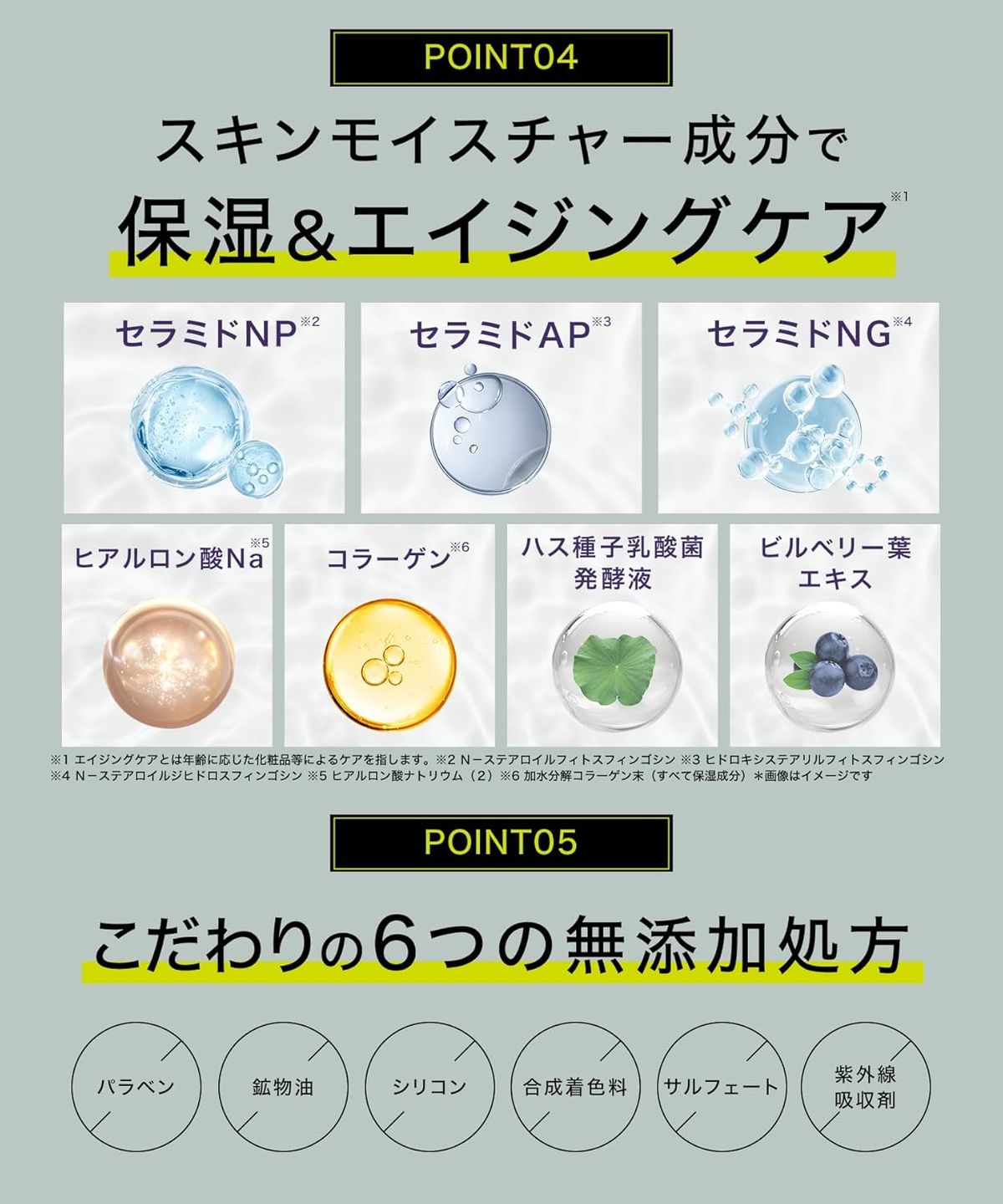 また、緑茶乾留エキスと紅茶エキス、カキタンニンエキスという肌をすこやかに保つ成分も配合。さらに、ヒアルロン酸やコラーゲン、3種のセラミドなど、肌の潤いを保つための成分も配合されている。