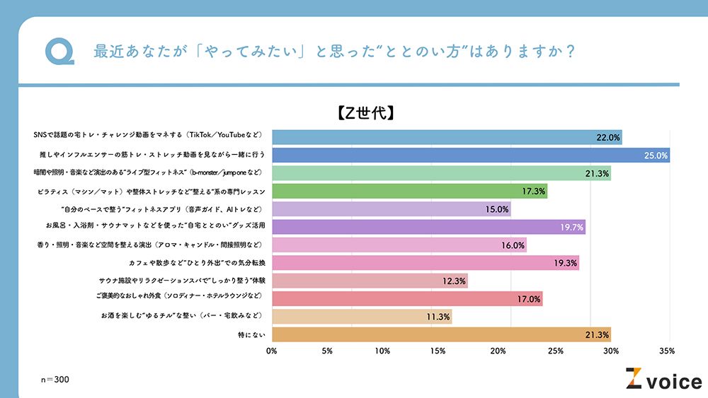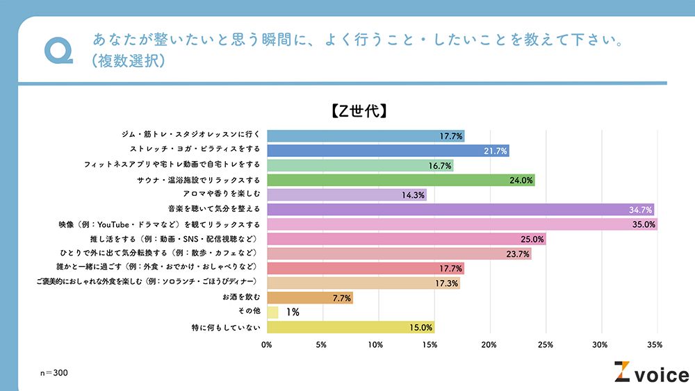 ではZ世代は、ととのいたいときに何をするのか。もっとも多かったのが、YouTubeやドラマなどの「映像を見てリラックスする」だった。ほかに、「音楽を聞いて気分を整える」、「推し活をする」、「サウナ・温浴施設でリラックスする」、「ひとりで外に出て気分転換」といった行動が上位に見られる。