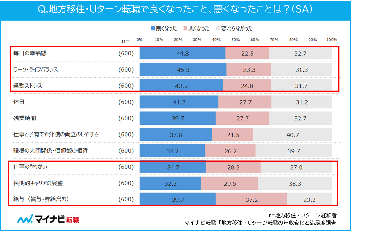 一方で、悪くなったこととしては「給与」(39.7%)が最多で、「仕事のやりがい」(34.7%)、「長期的キャリアの展望」(32.2%)も挙げられた。ここからは、給与面ややりがいでのマイナスがあっても、それ以上に生活面での満足度を重視する人が多いことがうかがえる。