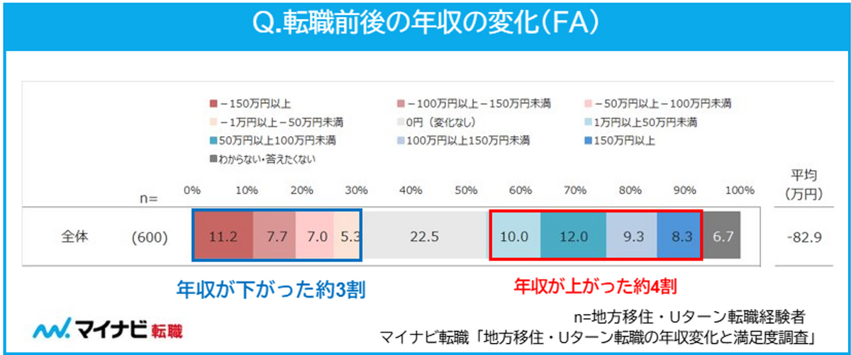 収入面では、地方移住転職・Uターン転職者の平均年収は413.4万円で、転職前の496.3万円から約80万円のダウンとなった。年収が下がった人が3割いる一方で、約4割は年収が上がっており、収入変化についても個人差が見られる。