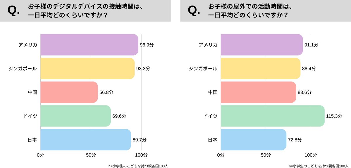 子供の生活習慣についても、興味深い結果が出ている。デジタルデバイスの接触時間は、アメリカが96.9分でトップ。次いでシンガポールが93.3分、日本が89.7分と続く。一方、子供の屋外での活動時間は、ドイツが115.3分でトップ。次いでアメリカが91.1分、シンガポールが88.4分となっている。日本は5カ国中最下位の72.8分であり、目のケア意識の低さが生活習慣にも表れているのかもしれない。