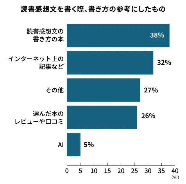 では、読書感想文を書く際に参考にしたものとしては、「読書感想文の書き方の本」が38%、「インターネット上の記事など」が32%となっており、「AI」はわずか5%に過ぎなかった。