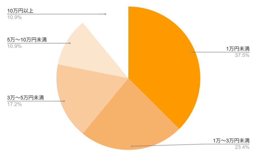 副業をしている人の月収を見ると、「1万円未満」が37.5%、「1万~3万円未満」が23.4%、「3万~5万円未満」が17.2%と続いており、生活の足しになる程度の収入の人が多い。そうした中で「10万円以上」という人が1割おり、本格的に収入を得ているケースもあるようだ。