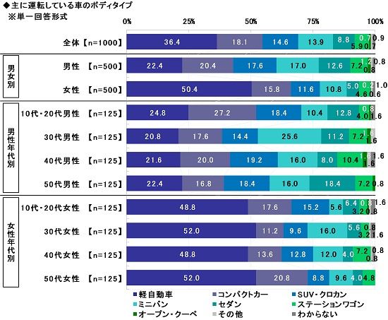 それによると、今乗っているクルマは「軽自動車」が36.4%で最も多く、「コンパクトカー」が18.1%、「SUV・クロカン」が14.6%と続いている。男女別に見ると、女性は「軽自動車」が50.4%と半数に上り、男性の22.4%に比べ倍以上であることがわかった。また、10代・20代男性では「コンパクトカー」が27.2%、30代男性は「ミニバン」が25.6%が最も多い結果となった。