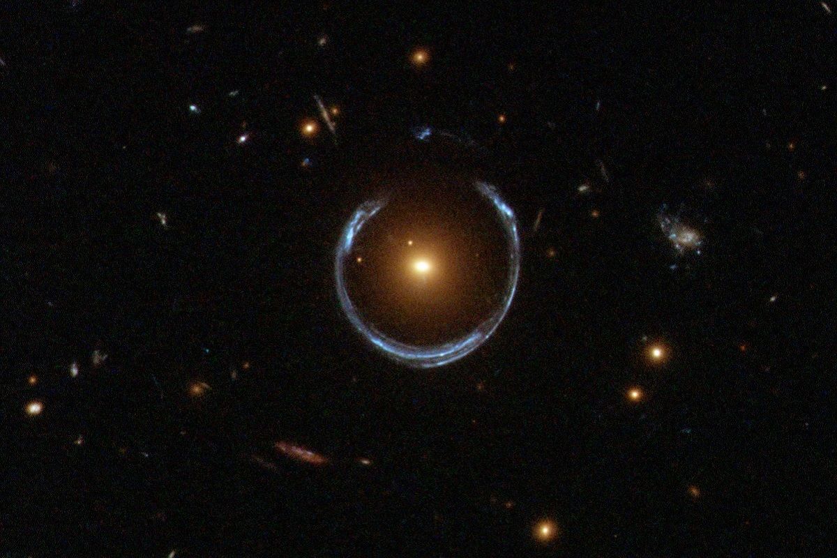 宇宙の馬蹄は、アインシュタインリングの典型的な一例だ。物理学者アルバート・アインシュタインが予言したように、質量によって時空が歪められることにより、地球から見て手前にある銀河がレンズとして機能し、背後の銀河を拡大している。光源とレンズと地球が一直線に並ばなければならないため、非常に珍しい現象となっている。画像では、青色の馬蹄形をしているのが遠方にある銀河で、その中の赤い銀河が手前に位置している。天文学者にとってより興味深いのは、青い馬蹄形の銀河だ。なぜならこの場合、137億年前に宇宙を生成したと考えられるビッグバンから約30億年後に形成された、より古い銀河だからだ。