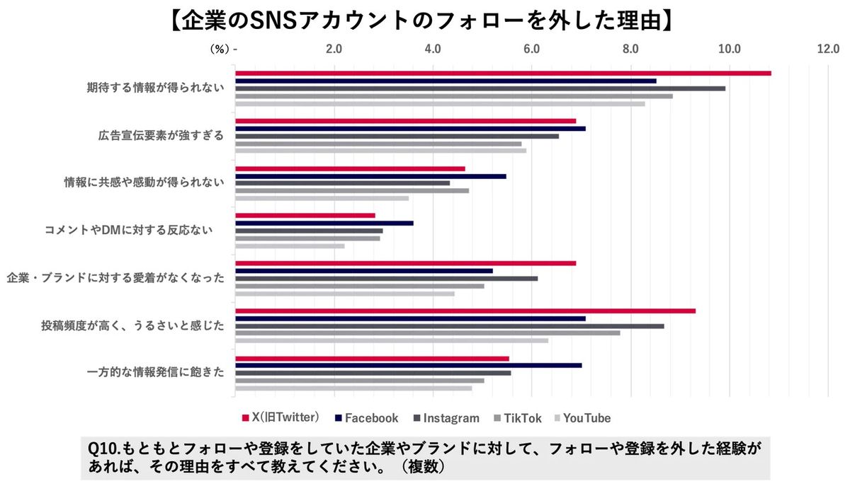 一方、企業のSNSアカウントのフォローを外した理由として、どのSNSでも「期待する情報が得られない」が上位に挙がった。次いで「投稿頻度が高く、うるさいと感じた」「広告宣伝要素が強すぎる」といった理由が多かった。