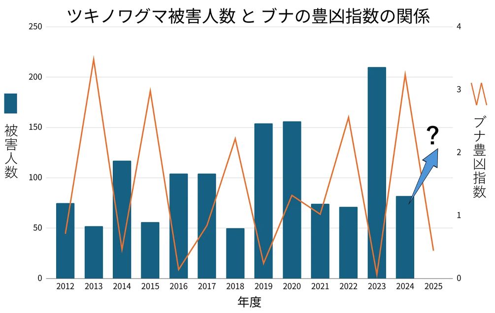 地図上には、クマと遭遇しやすい場所と危険度が色の点で示されている。青から赤に変わるに従って遭遇の確率があがる。同時に同サイトでは、ツキノワグマの習性や過去の被害状況などのデータも示されていて、マップとあわせてクマに遭遇しないための知識を深めることができる。たとえば、2012年からの「ツキノワグマ被害人数とブナの豊凶指数の関係」を示したグラフでは、ブナの実の出来とクマの被害件数が連動していることがわかる。日本気象によれば、2025年は「東北各県でブナが大凶作の見通し」とのことで、警戒が必要だ。