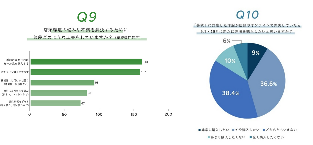 さらに、店頭で欲しい服が見つからない消費者は「季節の変わり目にセール品を購入する」「オンラインストアで探す」といった工夫をしていた。また「暑秋に対応できる服がオンラインで充実していれば購入したい」と答えた人は約半数にのぼった。