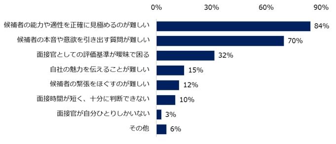 面接官として悩みを感じる人は81%に上り、もっとも多かったのは「候補者の能力や適性を正確に見極めるのが難しい」というもの。次いで「候補者の本音や意欲を引き出す質問が難しい」という声が続いた。