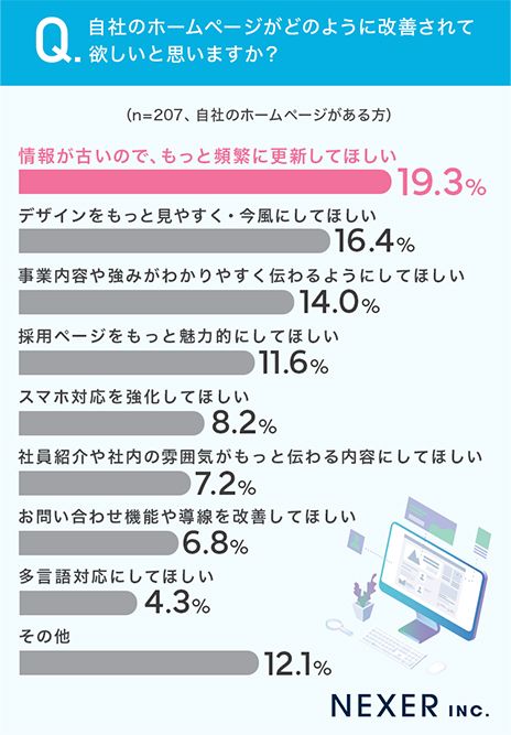 それなのに改善できずにいるのは、予算と人材の不足だと容易に想像がつく。事業内容の強みをわかりやすく伝えることが重要と訴える社員には、「もったいないから」と答える人もいた。せっかく立ち上げた自社ホーム−ページを活用しないなんて、本当にもったいない。アウトソーシングも検討すべきだろう。