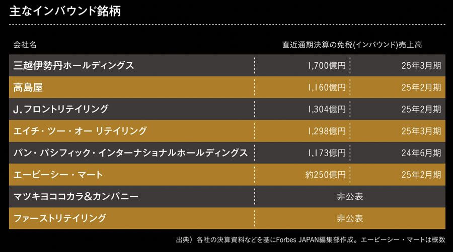 小売りセクターでは、売上高に対する免税売り上げの構成比が約10%以上ある企業がインバウンド銘柄として株式市場にとらえられることが多い。代表例は三越伊勢丹ホールディングス、高島屋、大丸や松坂屋、パルコを展開するJ.フロントリテイリングといった大手百貨店だ。直近の通期決算の数字を見ると、三越伊勢丹ホールディングスは免税売上高が1700億円2025年3月期)、高島屋は1160億円(25年2月期)、J.フロントリテイリングは1304億円(25年2月期)と、いずれも過去最高となっている。