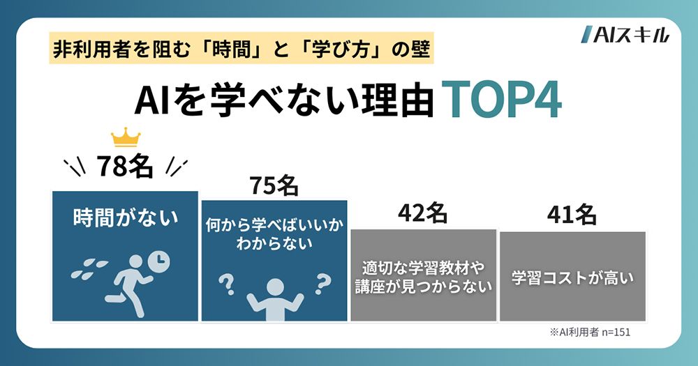とは言え、AIスキルがないと不利だと認識している非利用者は8割近い。彼らはなぜ使えないままでいるのか。どうして学ばないのか。その理由を尋ねると、第1位は「時間がない」だった。僅差で2位は「何から学べばいいかわからない」というもの。これらが、学びたくても学べない学習の「壁」となっていた。